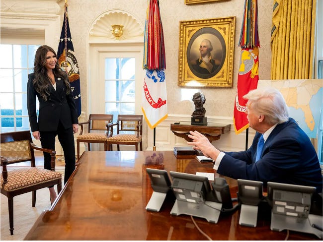 Kristi Noem tried, but didn’t get it. He is all that matters. Stealing the spotlight buys a one way ticket to Loosersville. The Boss didn’t dig the self-promotional videos she spent $220M of our money on, that, as Senator John Kennedy (R-Huckelberry) regarded as doing more to promote Kristi Noem than the Department of Homeland Security.