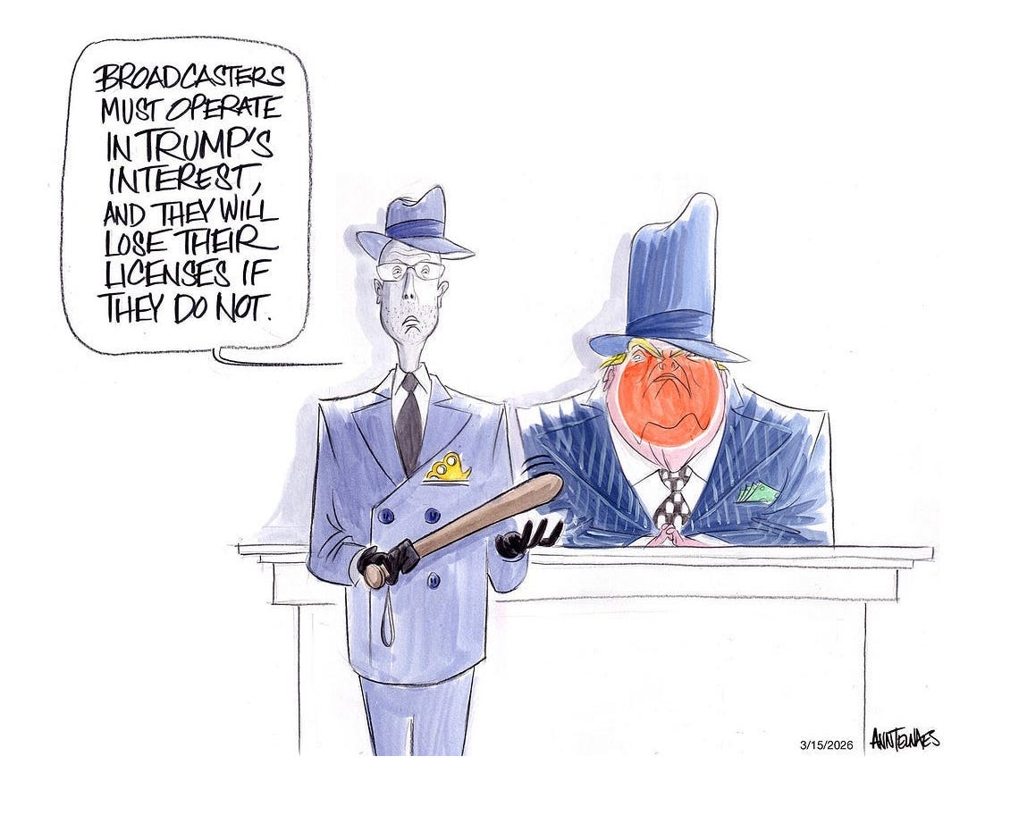Lately, FCC Chair Brendan Carr is getting in on the act. After issuing empty threats to Disney over Jimmy Kimmel’s monologues that lampooned the absurdity and danger of this presidency, he has been in the news very recently threatening to revoke broadcasters’ licenses over their coverage of the war in Iran. After President Trump called related reports “fake news,” Carr dutifully mounted his hobby horse and talked gangster-tough, even though he has no power to abrogate the First Amendment—yet.
