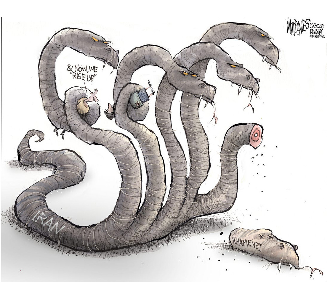 Oh, this is a hard one. Detestable, the Ayatollah, his minions, and the revolutionary guard. But is this our job? As you note in the piece, 'unwittingly invoking the law of unintended consequences." We are now on the verge of a region-wide conflagration, one it seems Bibi hoped for and manipulated the narcissist to bring about. Talk about unintended consequences. It is not clear to me how regional stability and security grow out of this war. Even a "plan" would not solve this dilemma; we had "plans" for Iraq (after a while), plans for Afghanistan (where the mission just grew and grew). How the US plans for somebody else's future escapes me; we are lousy at it, as was every colonial power in history. We already played this game in 1953, which led us to 1979. Now we have unleashed the Revolutionary Guard internally. The only people paying the price are the Iranian people, crushed between imperial bombing and internal authoritarians. Nice job, America!